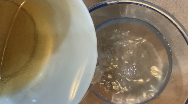 5. Decant. Stir the bowl well and then cover, allow it to sit for more than an hour to let the gold particles to settle in the bottom. Then carefully pour the water to the second bowl (the liquid here should be only water and gum, but if you happened to pour some gold into bowl 2, you can decant off the liquid later to collect the gold here). This step can be repeated for 2-3 more times by adding warm water to get rid of all impurities that might affect the gold shine.