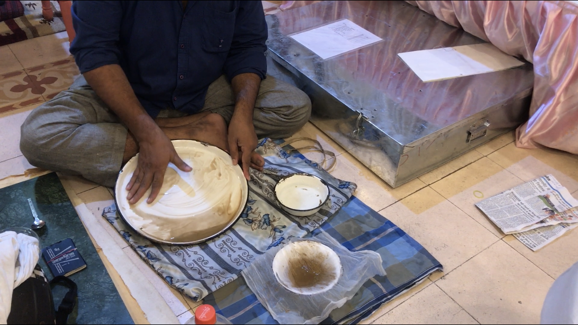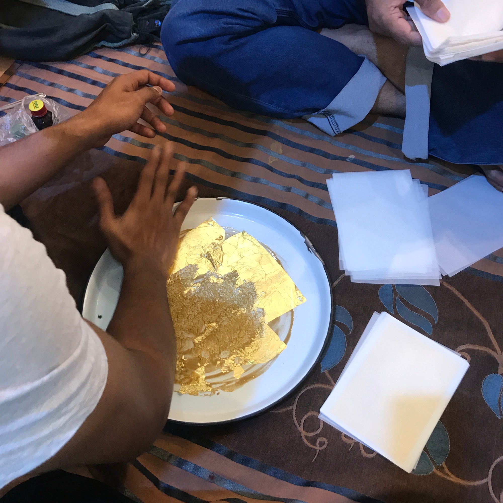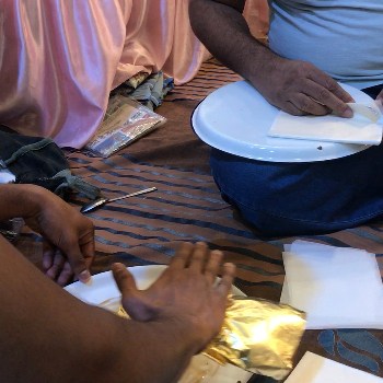 1. Dissolve – Apply a few drops of thick gum/honey and spread over the flat surface of the plate with side of the palm. Use this part of the palm to pick up a piece of gold leaf, tap and grind in circular motion until the gold leaf fully dissolves into particles to form paste before adding another leaf, and repeat the process for each leaf. Try to keep the area limited to the flat part of the plate, and on your hand, the side of the palm where the muscle bulges. As you continue to grind moisture will evaporate from the paste, so add a few drops of water, but keep the mixture tacky. If too much water is added, any more leaf added will form clots and will not dissolve.
